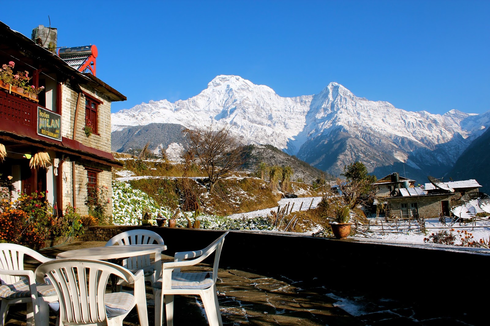 family. Many dignitaries and celebrities have stayed here and their names are carved on wooden plaques hung outside the room they stayed in. We just sit with an old friend for tea and conversation. The beauty of the shade, the grass, the trees and mostly, the view, gives a sense of youthfulness. It is a kind of paradise here in Pokhara.